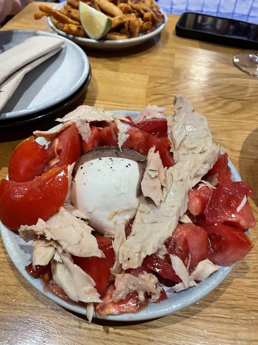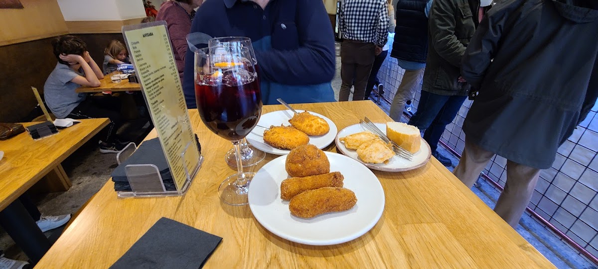We were staying in the neighborhood and passed this place several times a day. It was always packed. There were a couple of seats open on our last night so we ducked in and grabbed a spot. They have indoor and outdoor seating. If you’re not inside then folks can watch the game either through the windows or the seat’s outside. We weren’t super hungry so we ordered cerveza, txakoli, ensalada burrata and calamares. Seems more like a local hangout either way a handful of tourists sprinkled throughout.
